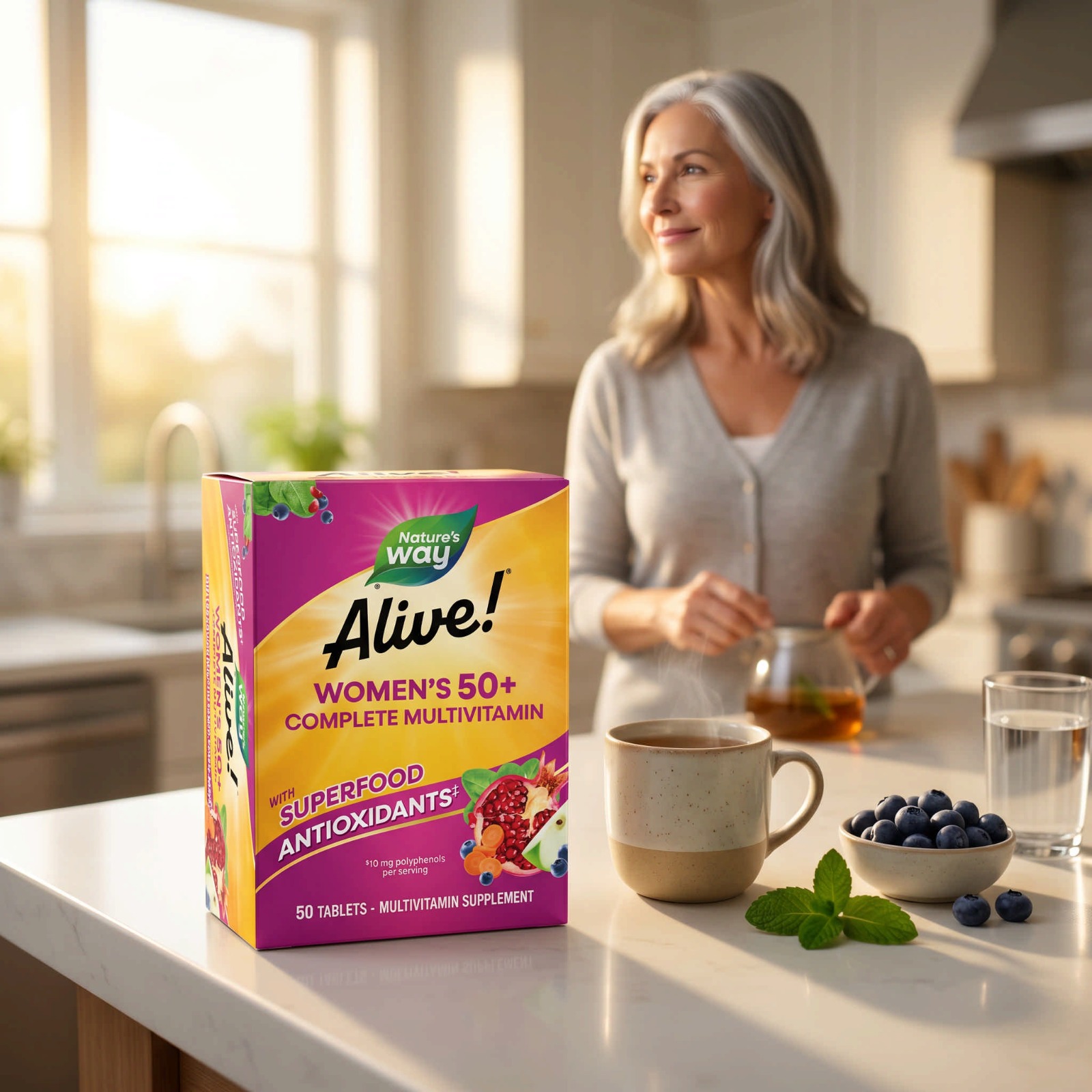 As you age, your nutritional needs change. Alive! Women?s 50+ Multivitamin is formulated to help you thrive after age 50 with 100% or more of the Daily Value of 19 vitamins and minerals, plus high potency B-vitamins to help convert food into cellular energy so you can live your best, most beautiful life every day.* This daily multivitamin supports skin health, eye health, bone health, heart health, cellular energy, and immune health.*